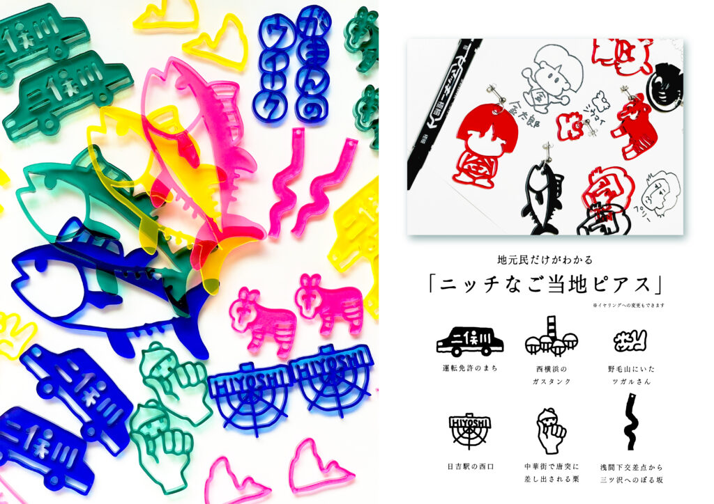 主催者によると「神奈川で活動する作家やクリエイターによる、色とりどりのホリデーギフトが集まる冬のPOPUP。ラグ作家による小物、イラストレーターによる様々な雑貨、テキスタイルデザイナーによる布小物など心が弾む多彩なアイテムが並びます」とのこと。草山は、今週から展開するイラストアクセサリー「地元民だけが分かるニッチなご当地ピアス・イヤリング・キーホルダー」を委託販売していただく運びとなりました。